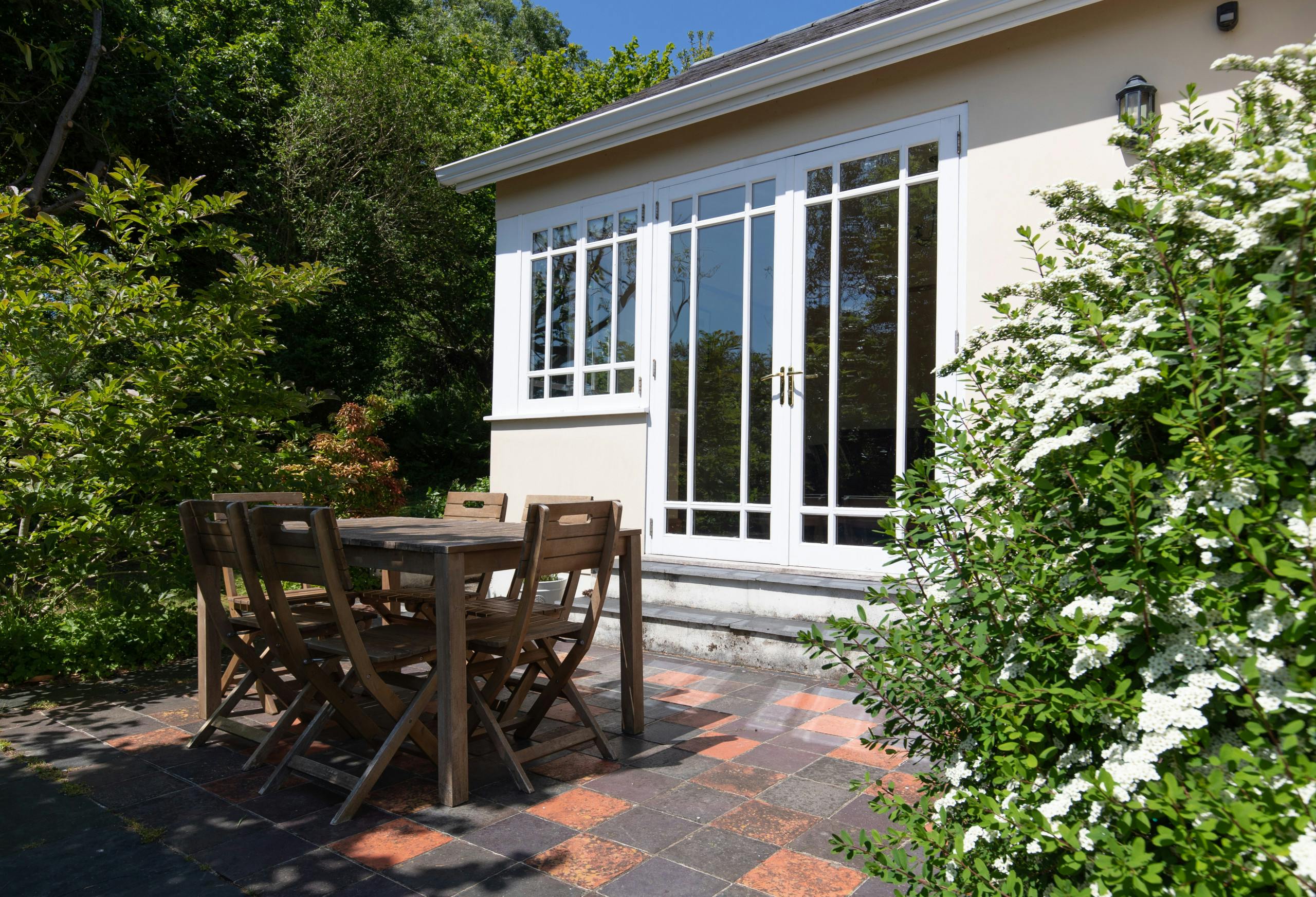 Garden room: two 2-seater sofas, desk, and chair for remote working. French doors to the garden terrace