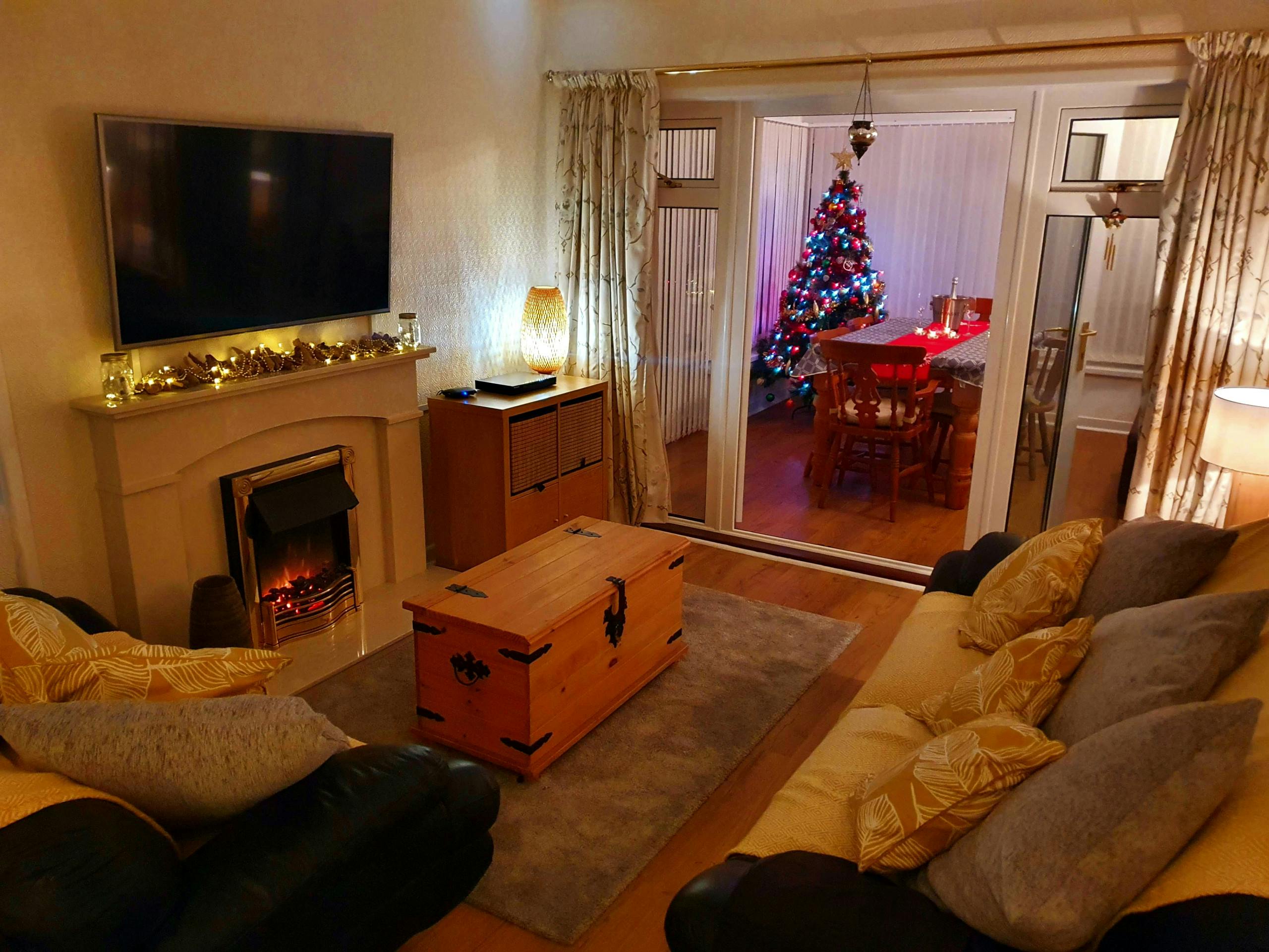Sitting room: 3-seater sofa, 2-seater sofa, 50" Freeview TV, DVD player, electric fire, garden views via conservatory